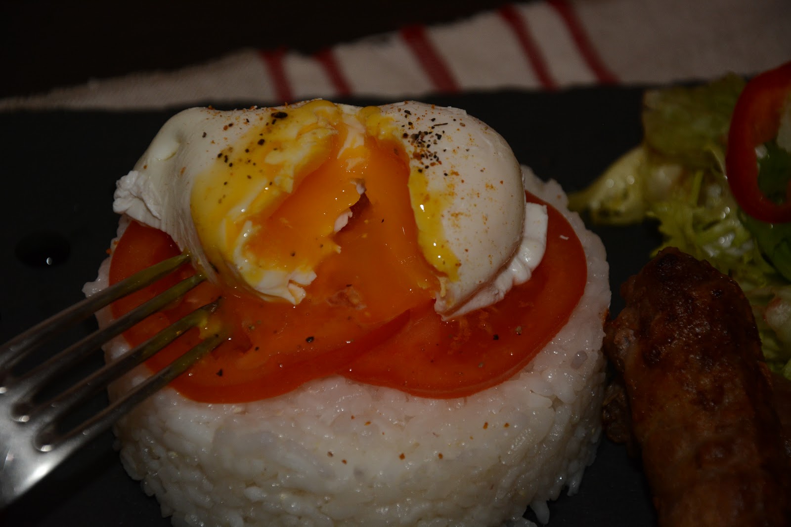 3. В маленькій каструльці довести воду до кипіння (каструлю заповнити на 2/3 води), посолити та додати майже 1 ст.л. оцту. Яйце розбити в маленьке блюдце, не пошкодивши жовток. В каструлі ложкою зробити круговорот води за годинниковою стрілкою, і в ту серединку додати розбите яйце. Поки вода буде крутитись - білок яйця буде схоплюватись і яйце буде тримати форму. Варити на власний смак (до якого стану жовток довести, маю на увазі) - по 2 хв для кожного стану менше, ніж у звичайних яйцях. Варити лише по одному такому яйці одночасно (хоча я вже навчилась і по 2 відразу))) Дістати шумівкою, дати на окремій тарілці стекти воді (кілька хв) і посиипати приправами (в мене мелений перець та італійські трави).